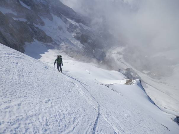 hinunter lässt uns schlucken. Wir sehen etwa 300 Meter die steile Firnflanke